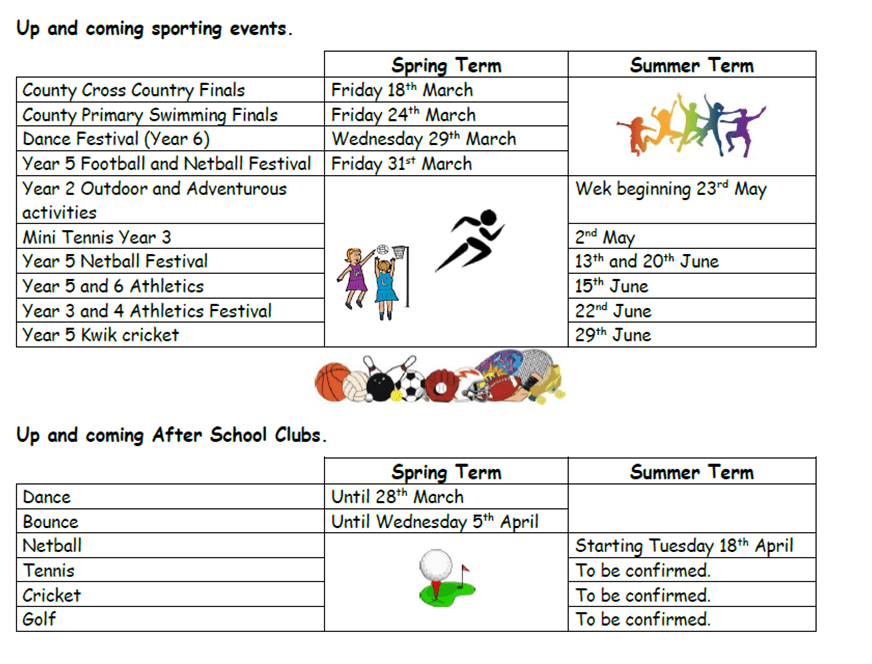Please see below details of sporting events which will be taking place during the remainder of the Spring term and the Summer term. Please note, children who are taking part in any of the events or clubs will be informed nearer the date.